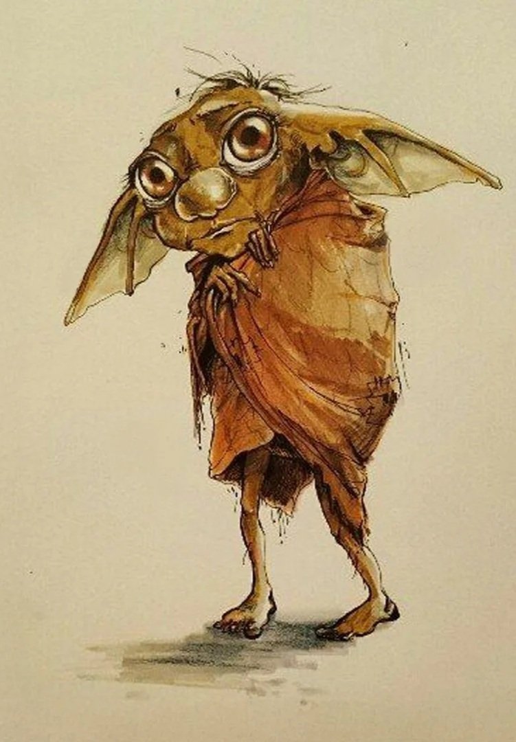 Harry speaks softly, “Dobby?” The elf jumps. “No, sir. I is Winky.” Her voice is tiny and high. She hides her face, then slowly looks at Harry again. “You is Harry Potter!” Harry nods. “Do you know Dobby?” Winky nods sadly. “Dobby is free now. A free elf wants money and no one wants a house-elf who asks for money.” Harry feels strange hearing this. He thinks freedom is good. But Winky shakes her head. “House-elves do work. We do not ask for fun. We do what our family says.”