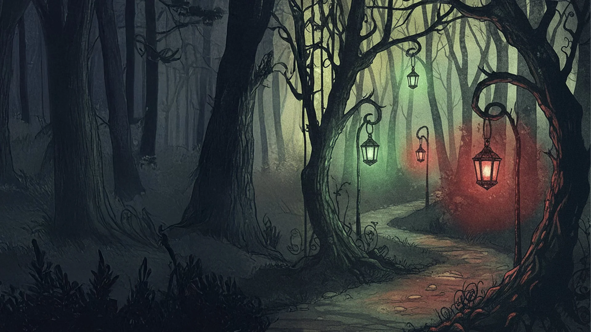 Harry, Ron, Hermione, and the Weasleys walk quickly through the dark trees. Bright lanterns hang from the branches and show the way. They can hear thousands of people. Many voices laugh, sing, shout, and talk with excitement. Harry feels happy too. His heart beats fast. He knows something amazing waits ahead.