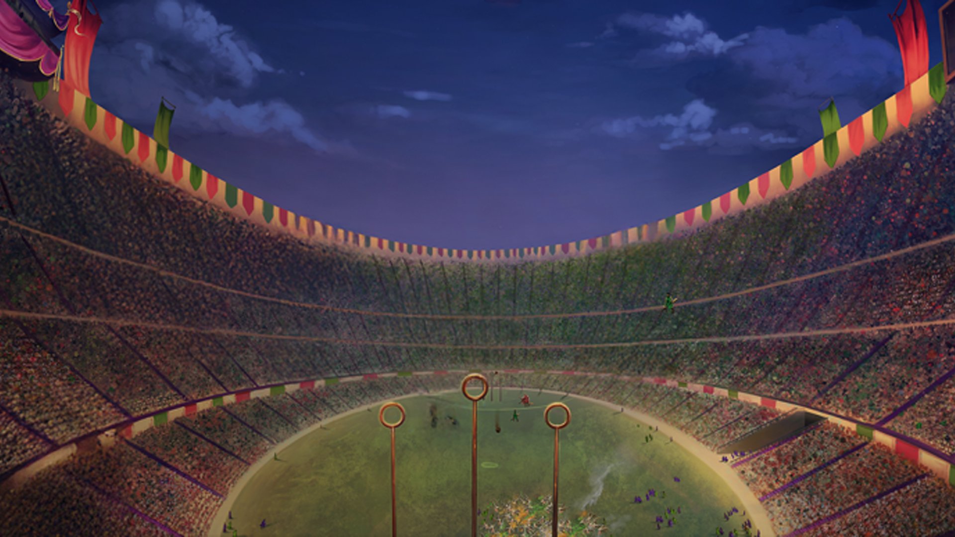 Harry looks down. He sees a sight he cannot believe. There are one hundred thousand wizards and witches in the stadium. The field is large and green like smooth velvet. Golden light shines everywhere. In the row behind them sits a house-elf with large eyes and ears. It wears only a tea-towel as clothes. Harry remembers Dobby, the elf he once helped to freedom.