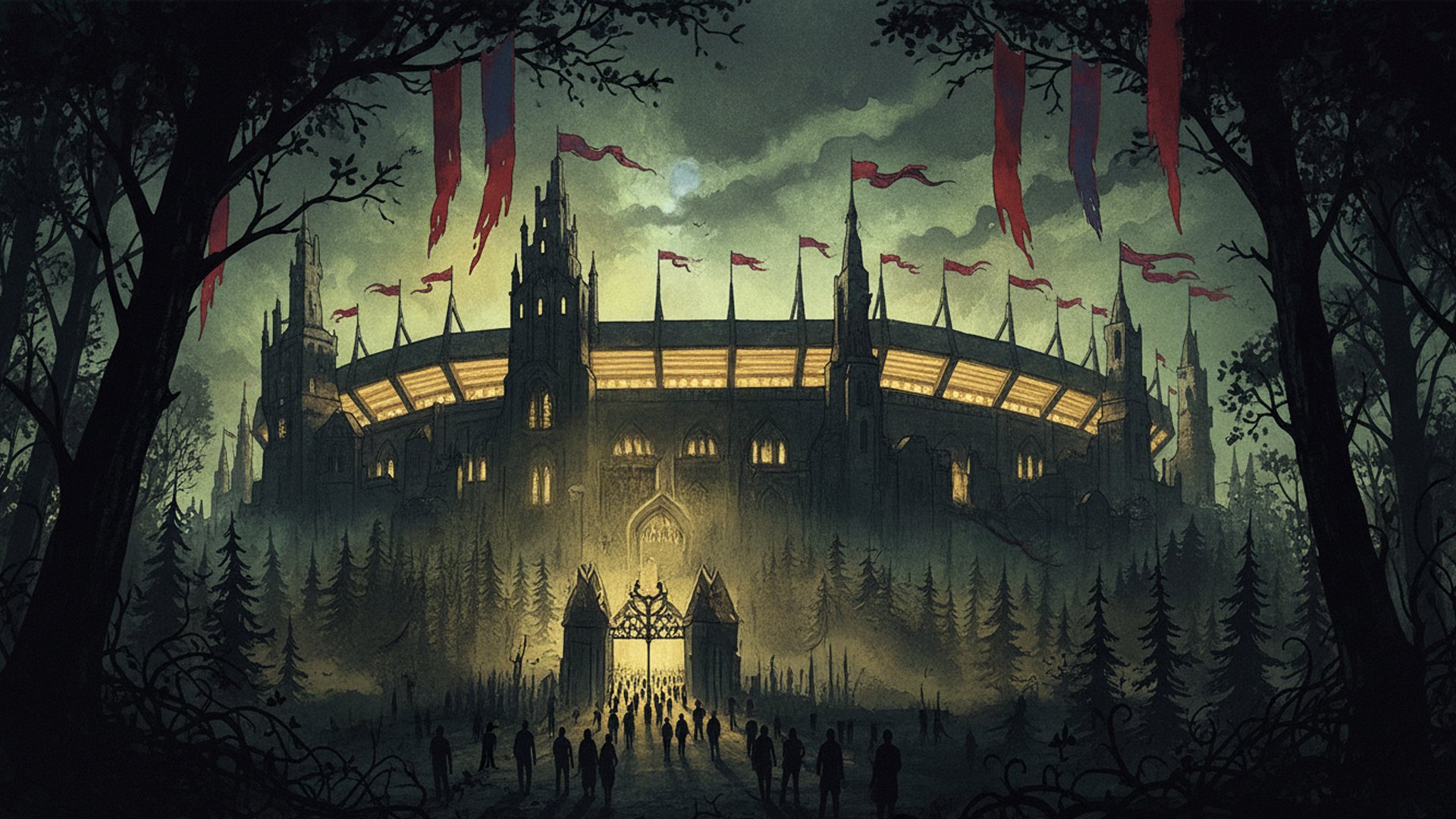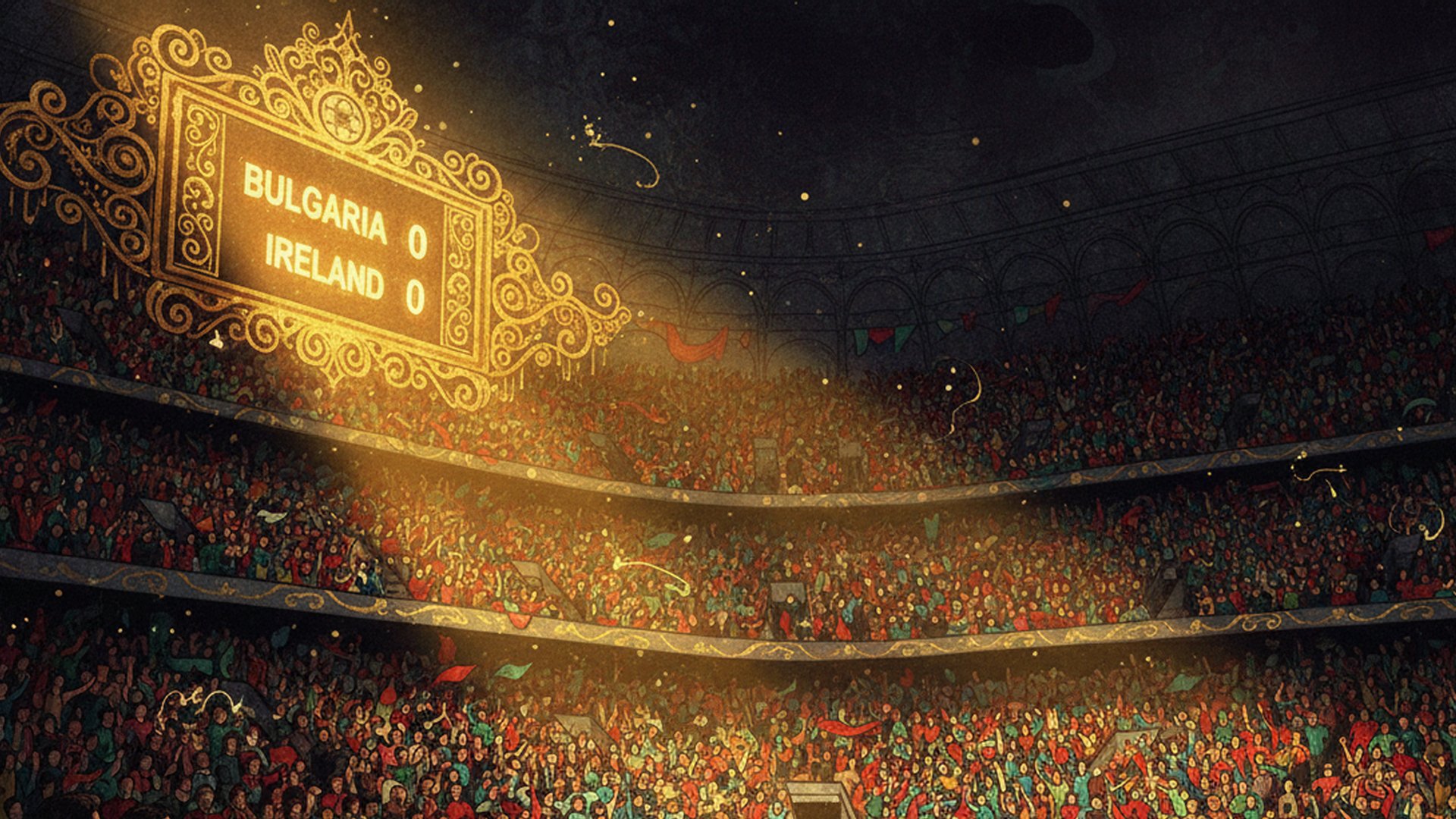 Soon, Ludo Bagman appears. He is loud, cheerful, and full of energy. He holds his wand to his throat and yells, “Sonorous!” His voice becomes huge. “Ladies and gentlemen! Welcome to the four hundred and twenty-second Quidditch World Cup Final!” The crowd explodes with cheers. Thousands wave flags of green and red. The scoreboard shows: