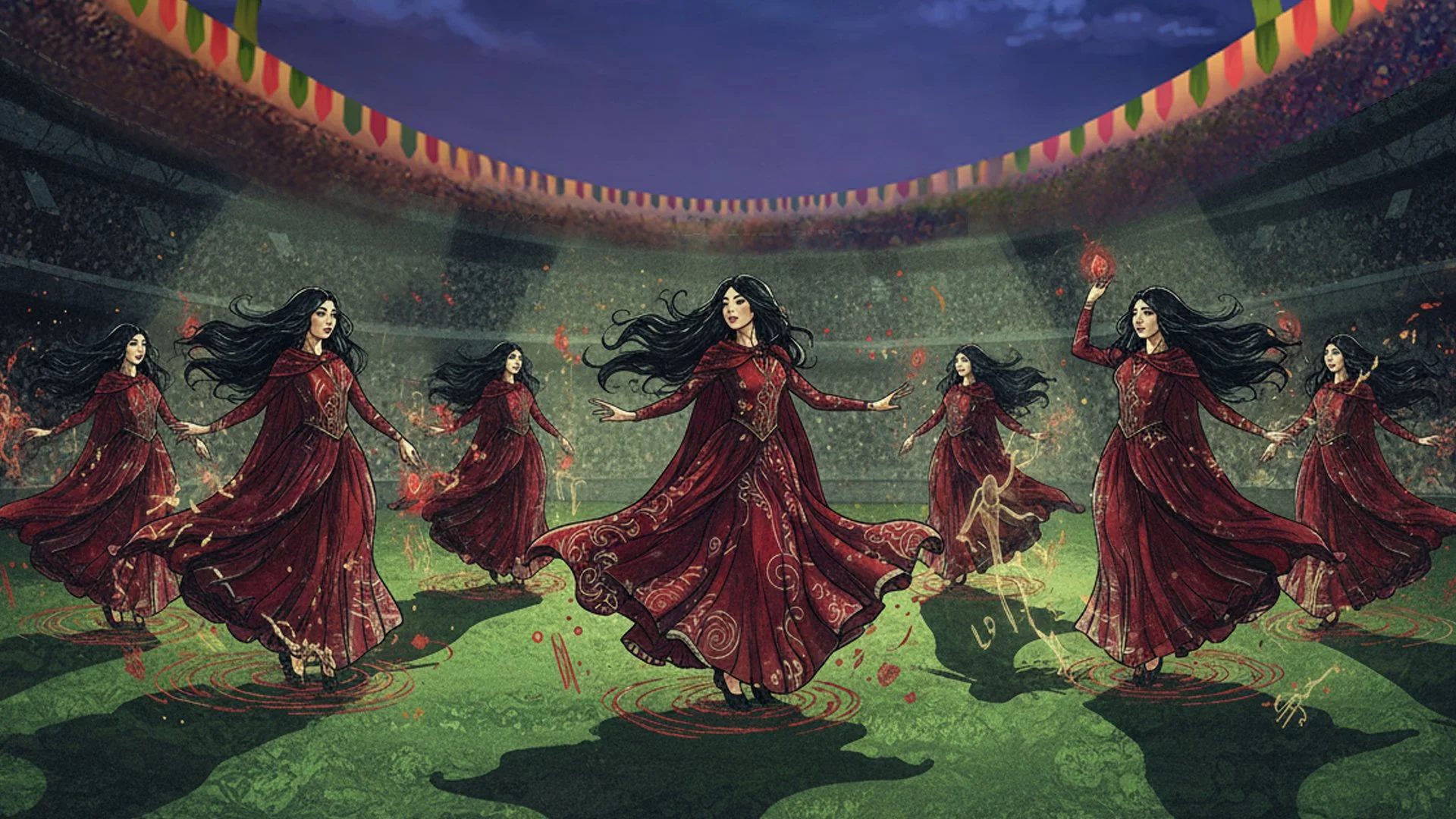 Bagman shouts, “Now, the Bulgarian team mascots! The veela!” Beautiful women step onto the field. They move like light and fire. Their hair flows without wind. They begin to dance. The music is soft at first, then stronger. Harry forgets everything. His mind feels light and empty. He thinks only of the dancers. They shine like magic. Ron stands too, his eyes wide. Harry places one foot on the wall, ready to climb over, without knowing why.