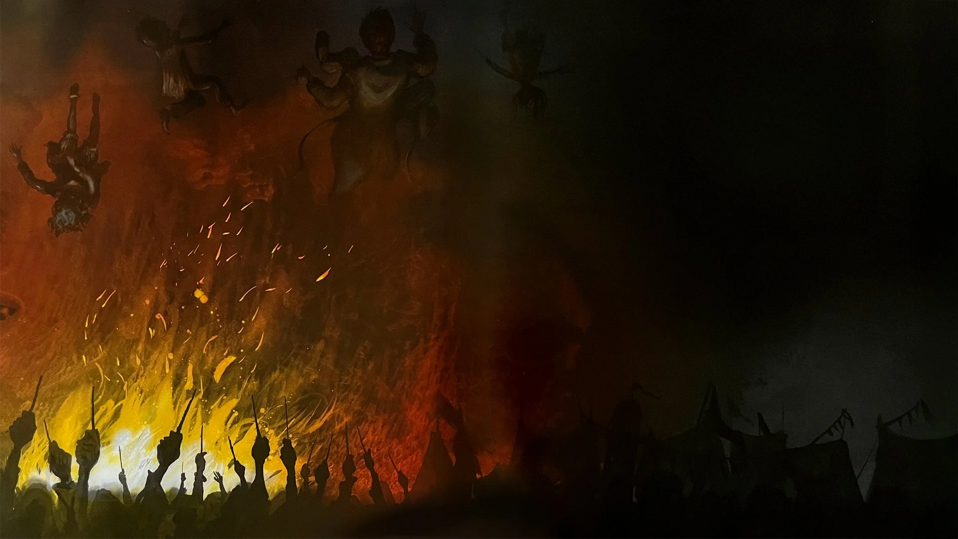 The marching wizards laugh loudly. One of the masked wizards points his wand at a tent. A blast of green light shoots from the wand. The tent burns bright orange with fire. More screaming fills the night. Mr. Weasley returns with Hermione and Ginny. Bill, Charlie, and Percy come from the other tent, already dressed. Their wands are ready.