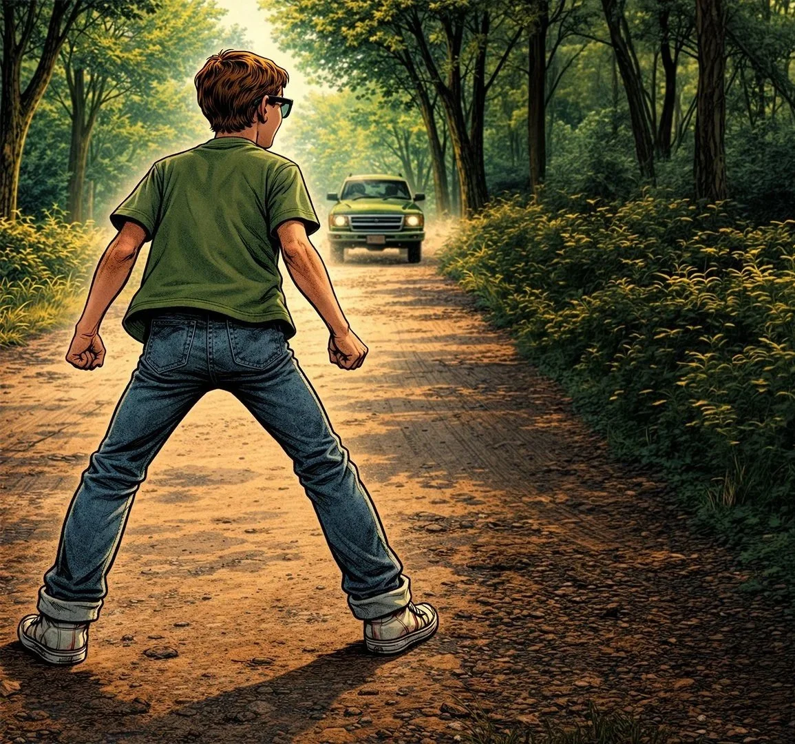 He is sweating a lot. He is breathing fast. “Wait ‘til you hear this,” he says. “What?” I ask. “Let me breathe,” he says. “I ran all the way here from my house.” “That’s crazy,” Chris says. “It’s too hot for that.” It is crazy. Vern’s house is more than three kilometers from the treehouse. “This is important,” Vern says. “You won’t believe it.”