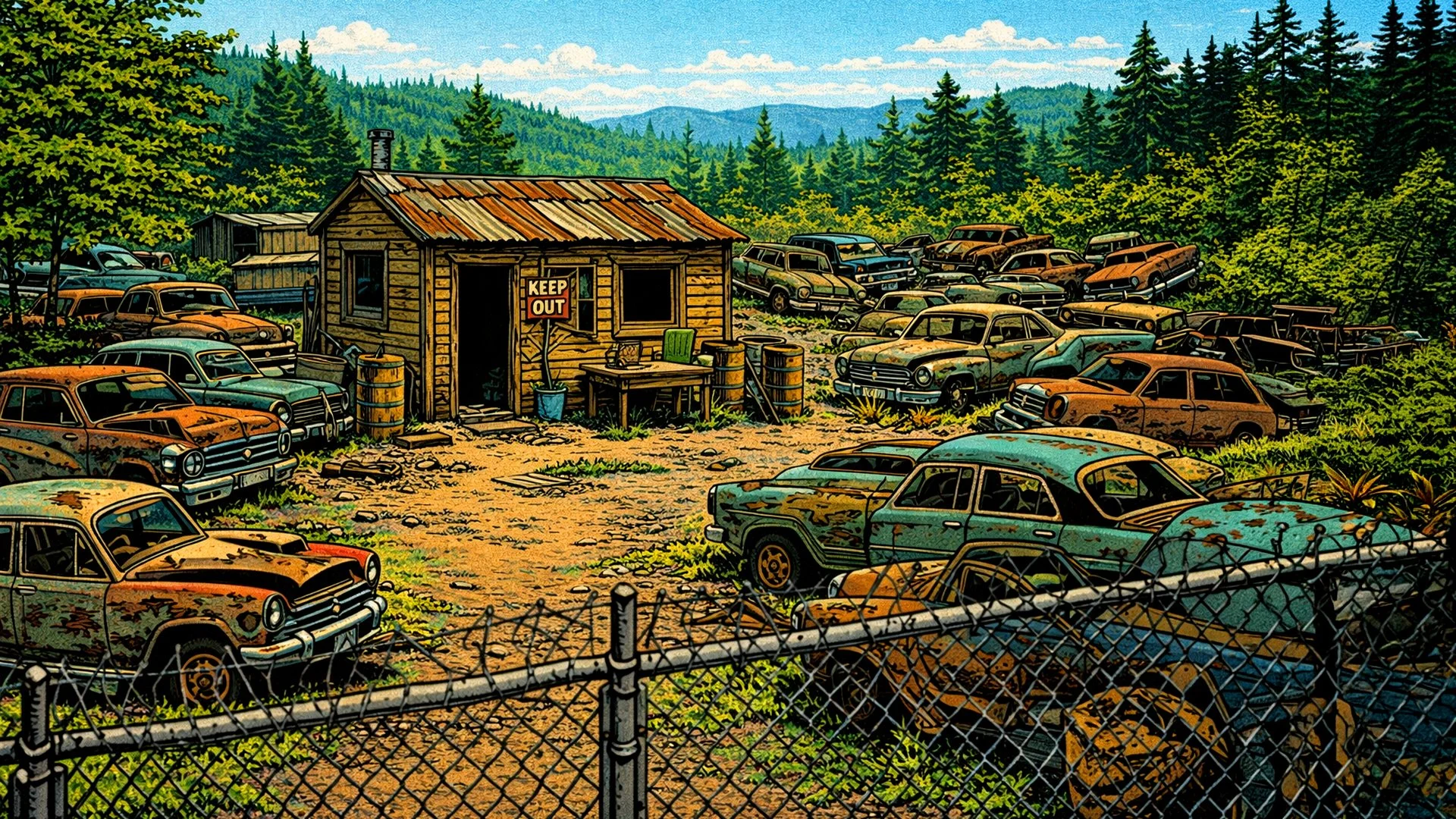 We were always careful when we went to the dump. Because the manager there has a dog. They say that the dog likes to kill kids. So when we stole that roof, we moved fast. One day we also found an old screen door. It was rusty, but it keeps the flies out. When we look through it, everything always looks a little dark, like sunset.